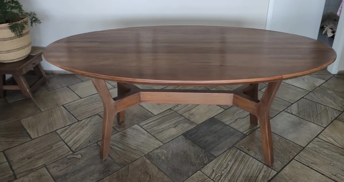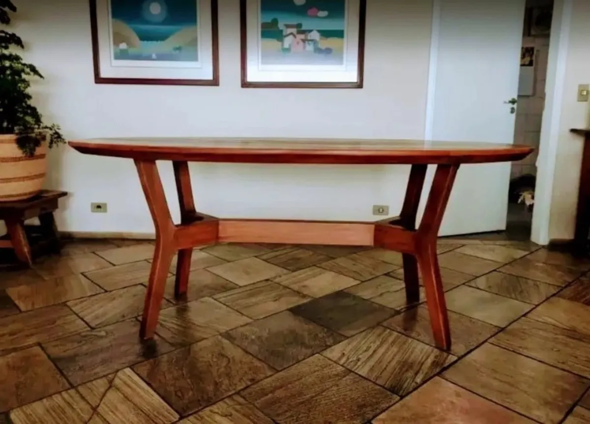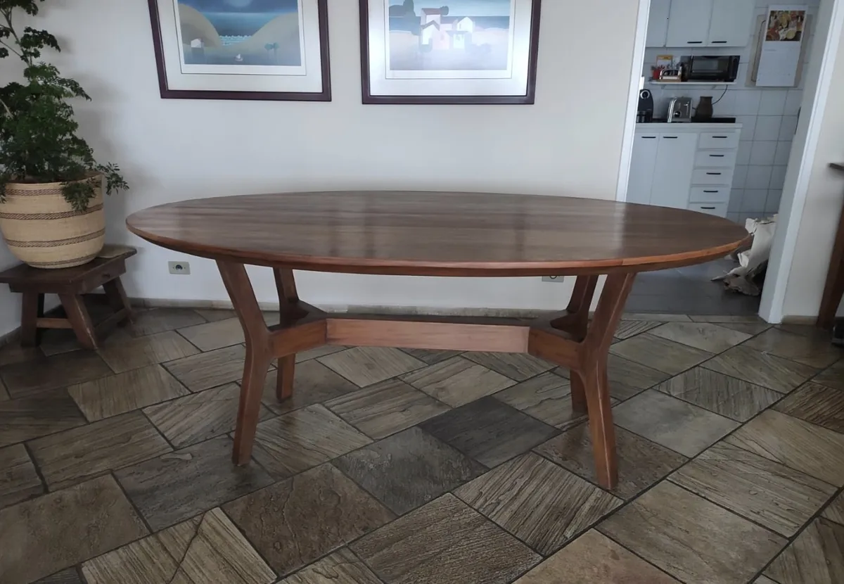 Mesa Oval com Base formato X, em madeira de demolição, fabricada em Peroba Rosa antiga.