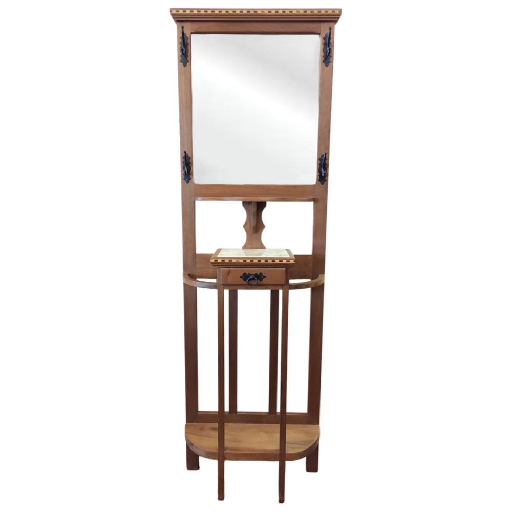 Chapeleiro/cabideiro em madeira maciça peroba rosa antiga, com marchetaria na moldura e na gaveta, mármore travertino e espelho.