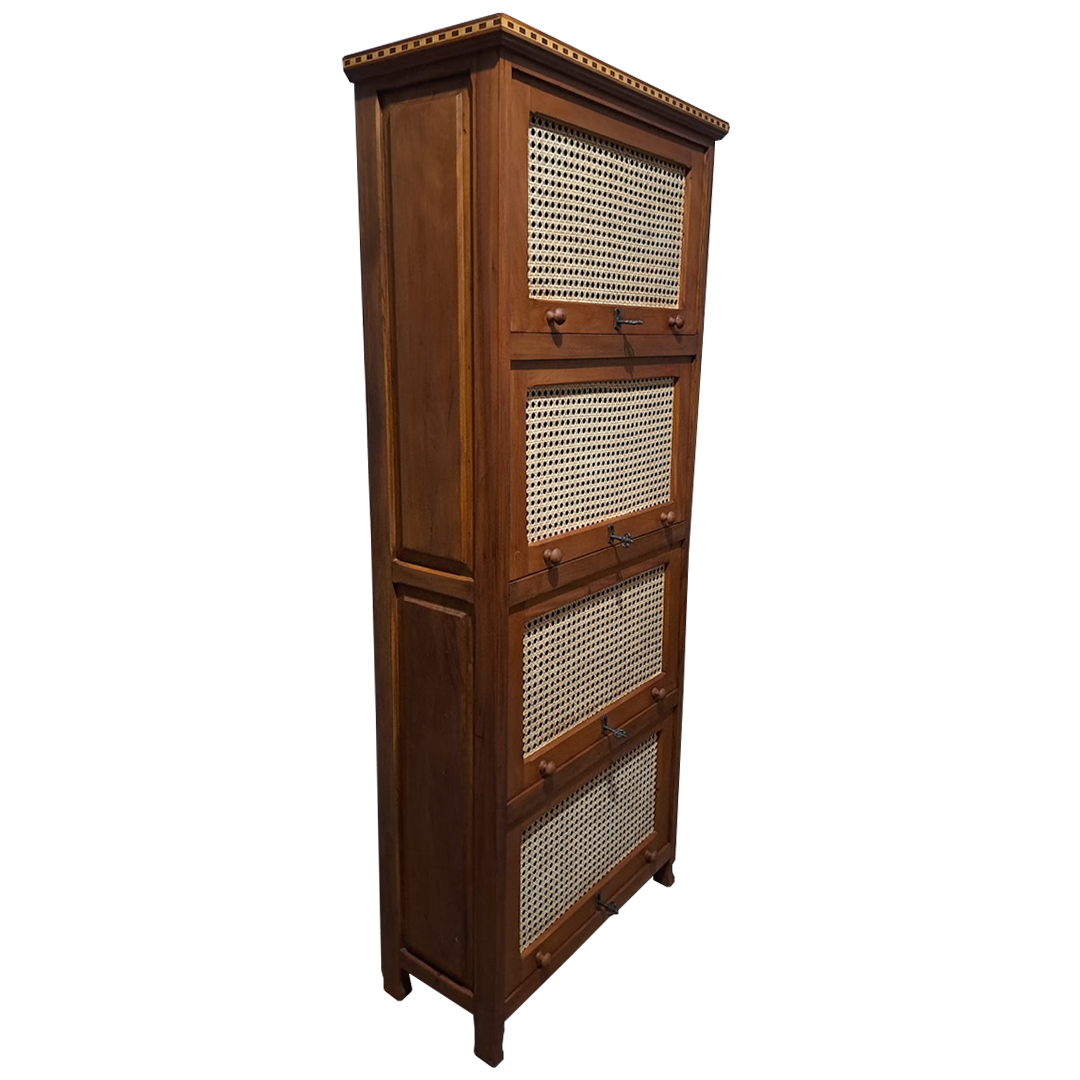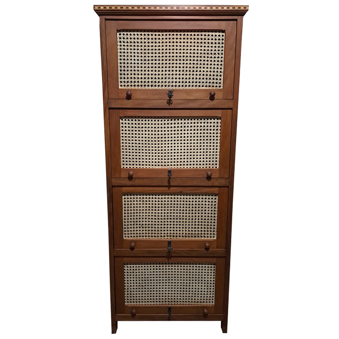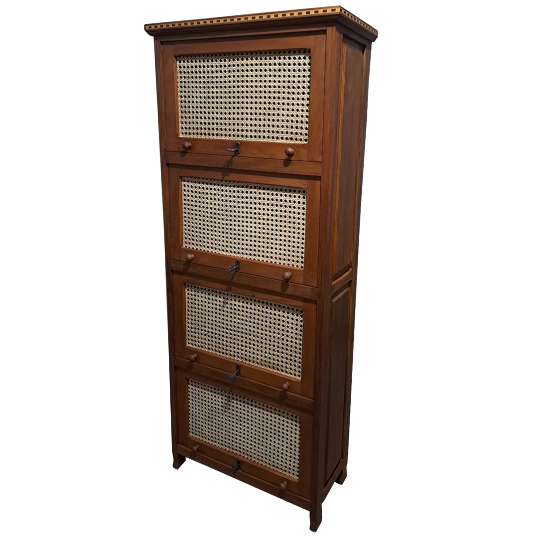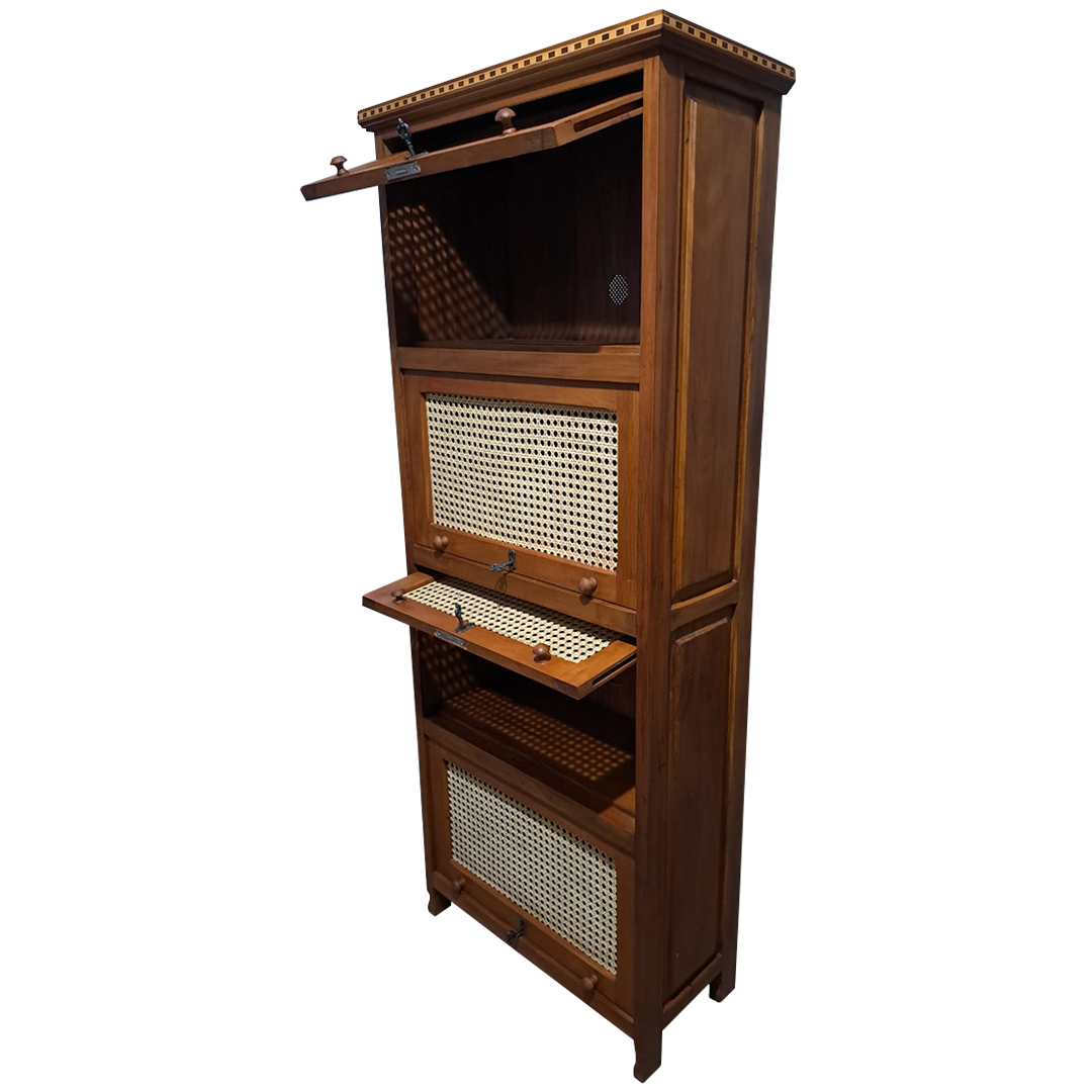 Livreiro/ estante marchetado, com portas de madeira, palha brasileira retráteis e fechadura.