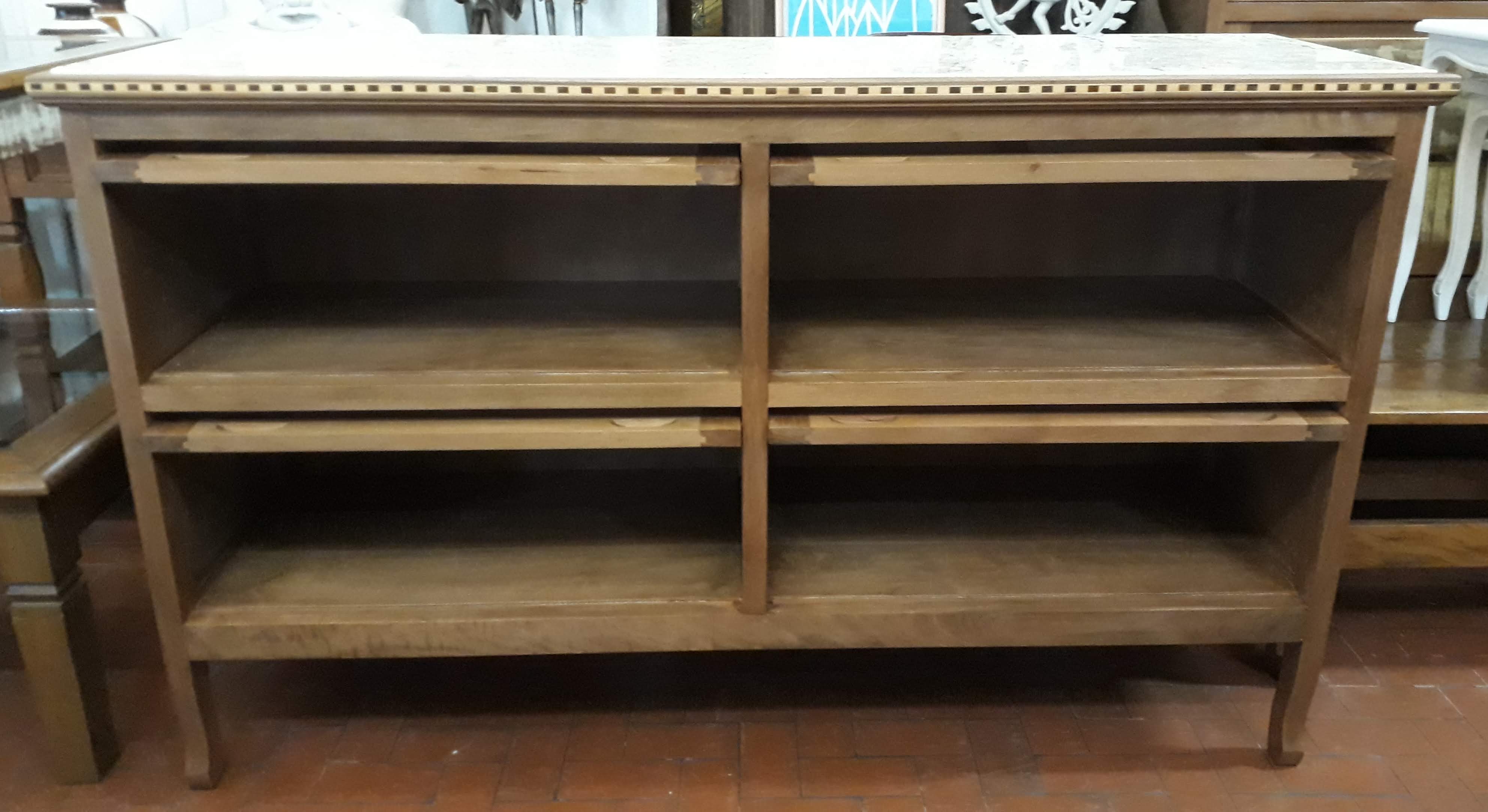 Buffet de peroba rosa, madeira maciça de demolição, com moldura marchetada, 4 portas retráteis e mármore travertino no tampo.