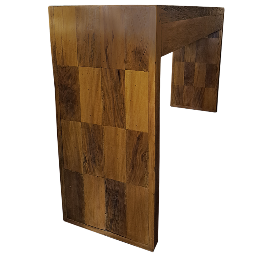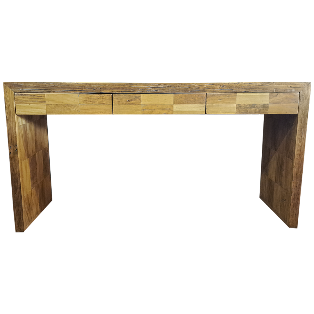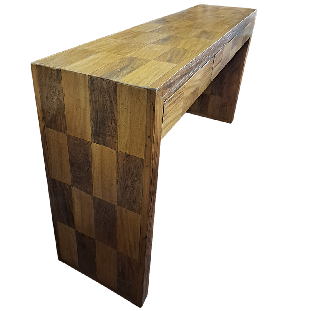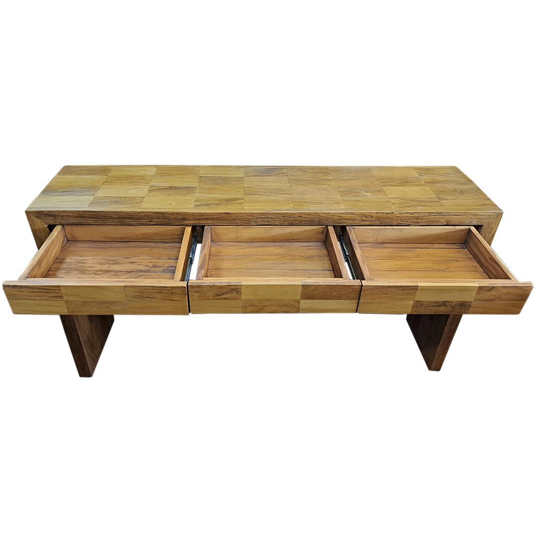 Bancada/Aparador marchetado de madeira maciça, peroba rosa antiga, 3 gavetas com corrediças telescópicas.