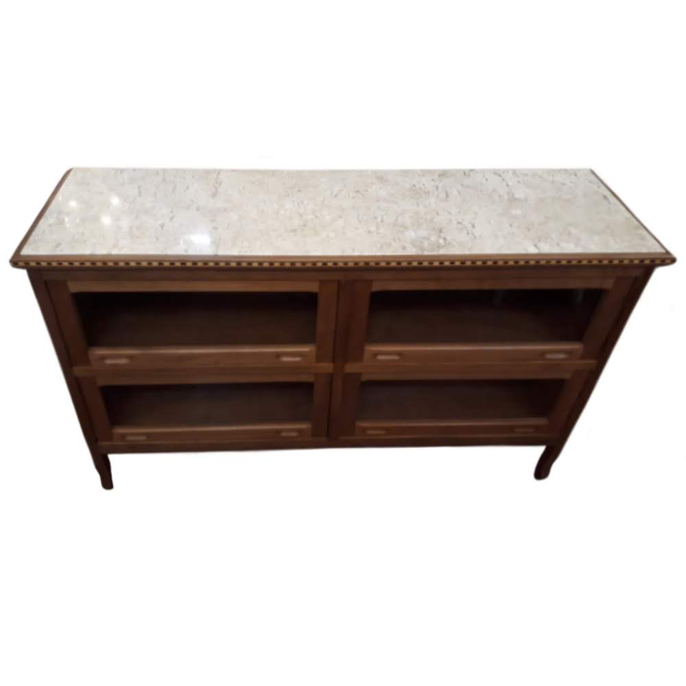 Buffet de madeira maciça, peroba rosa antiga, com moldura marchetada, 4 portas retráteis e mármore travertino no tampo.