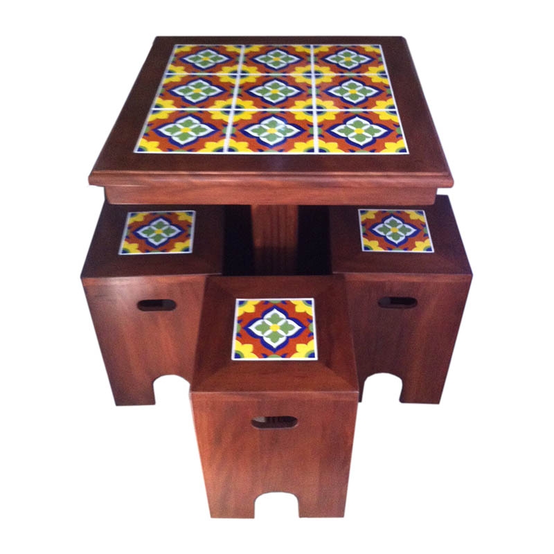 Conjunto de mesa quadrada com azulejos em peroba rosa de demolição com 4 bancos. Ideal para uso na varanda e em ambientes com espaço reduzido.