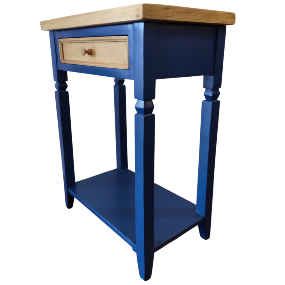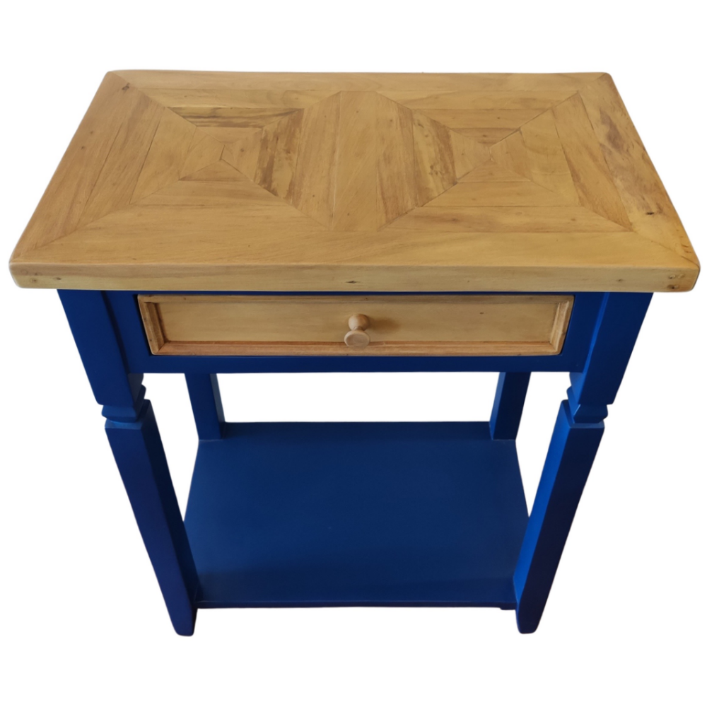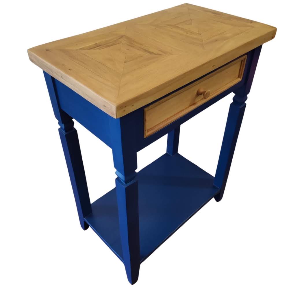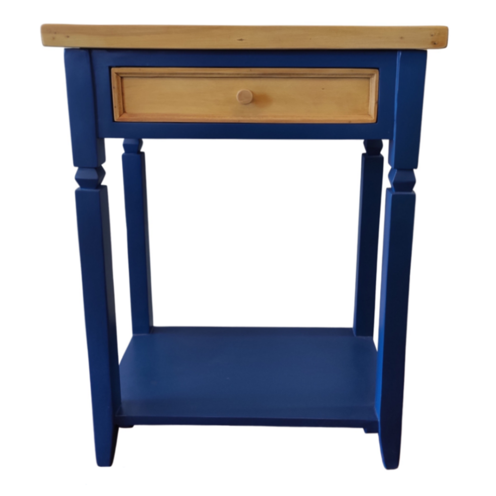 Acabamento azul laqueado com a gaveta e tampo lustrados.