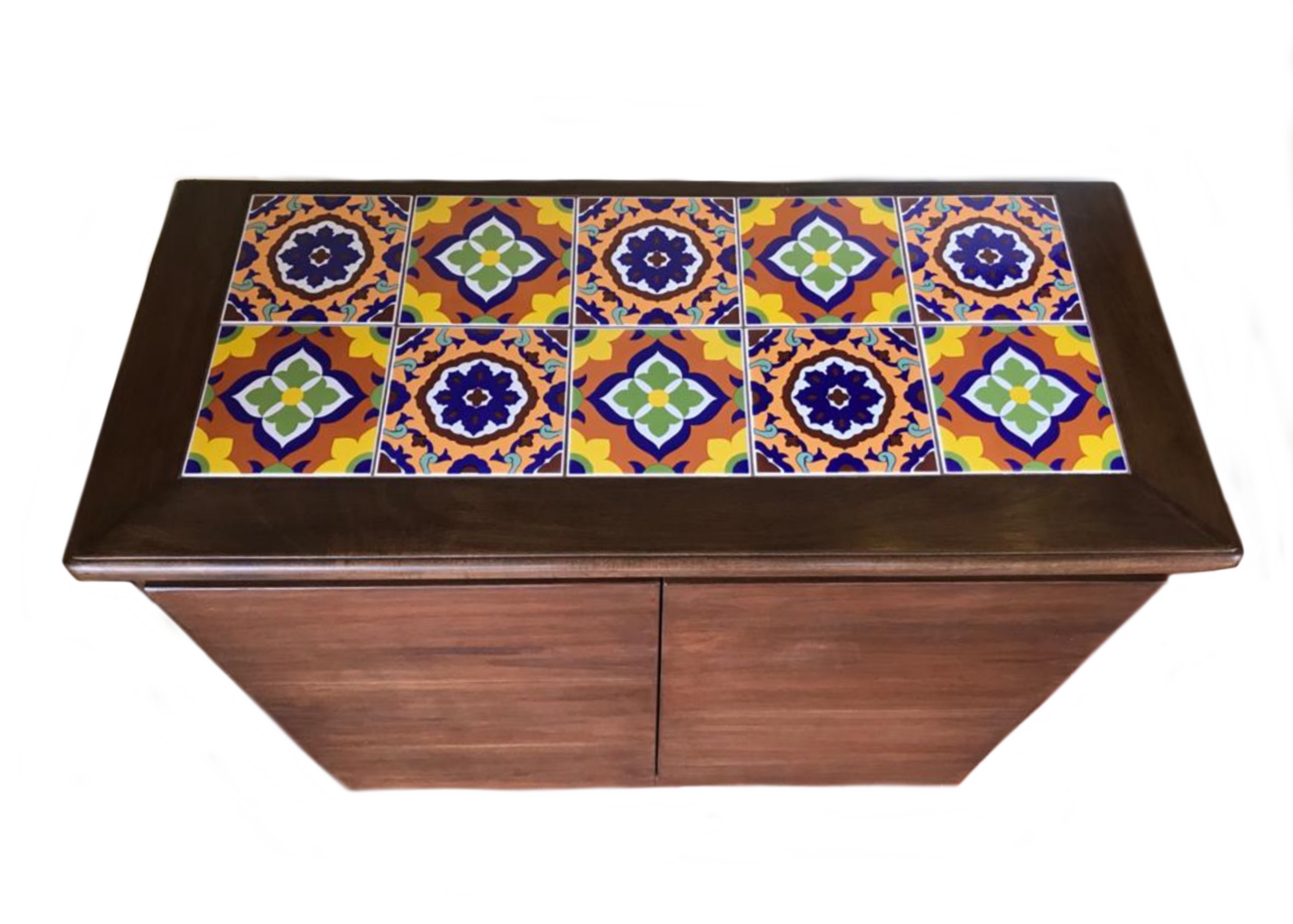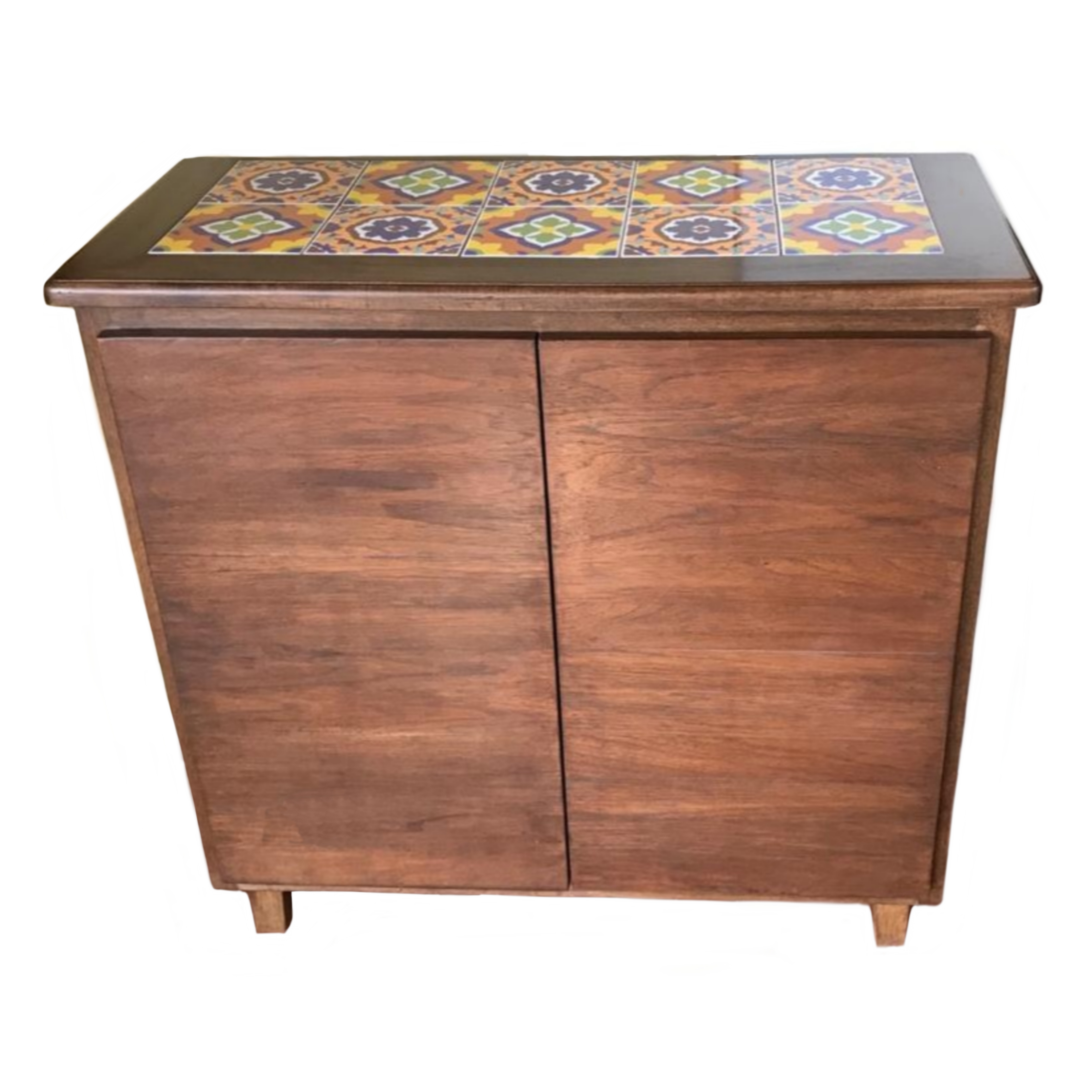 Buffet de madeira maciça Jequitibá, com 10 azulejos, 2 portas e 1 prateleira interna.