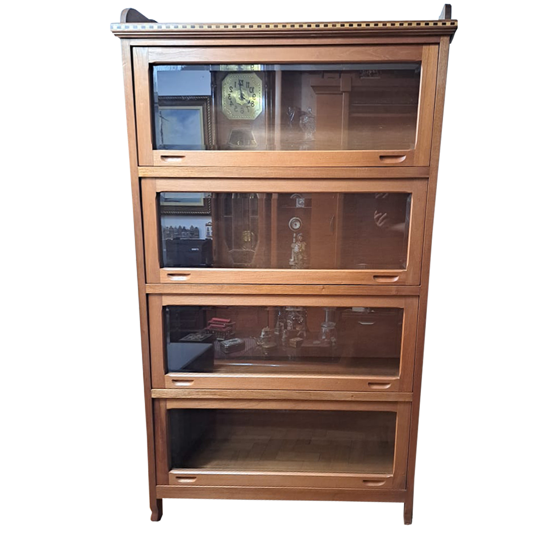Livreiro/Estante Biblioteca marchetado de peroba rosa antiga, com portas de vidro bisotê retráteis. Perfeito para acomodar e proteger livros e demais objetos.