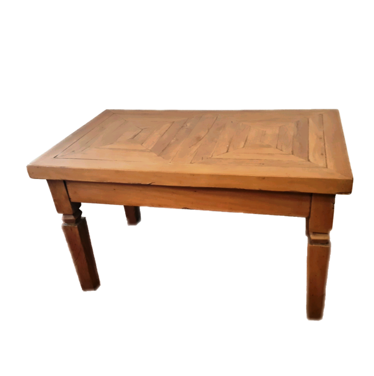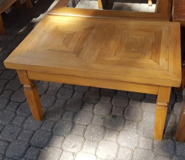 Mesa de centro de madeira maciça, peroba rosa de demolição, com tampo marchetado