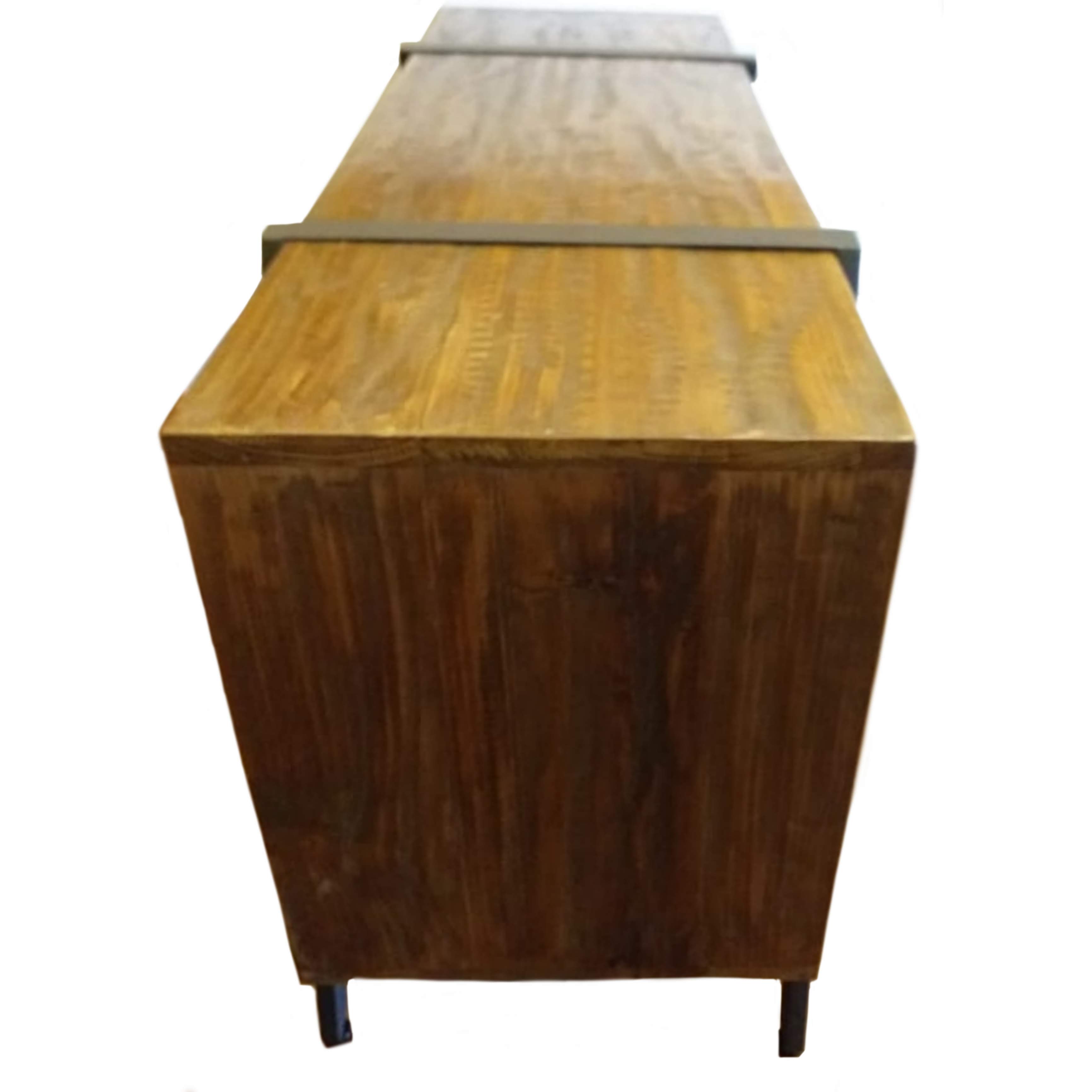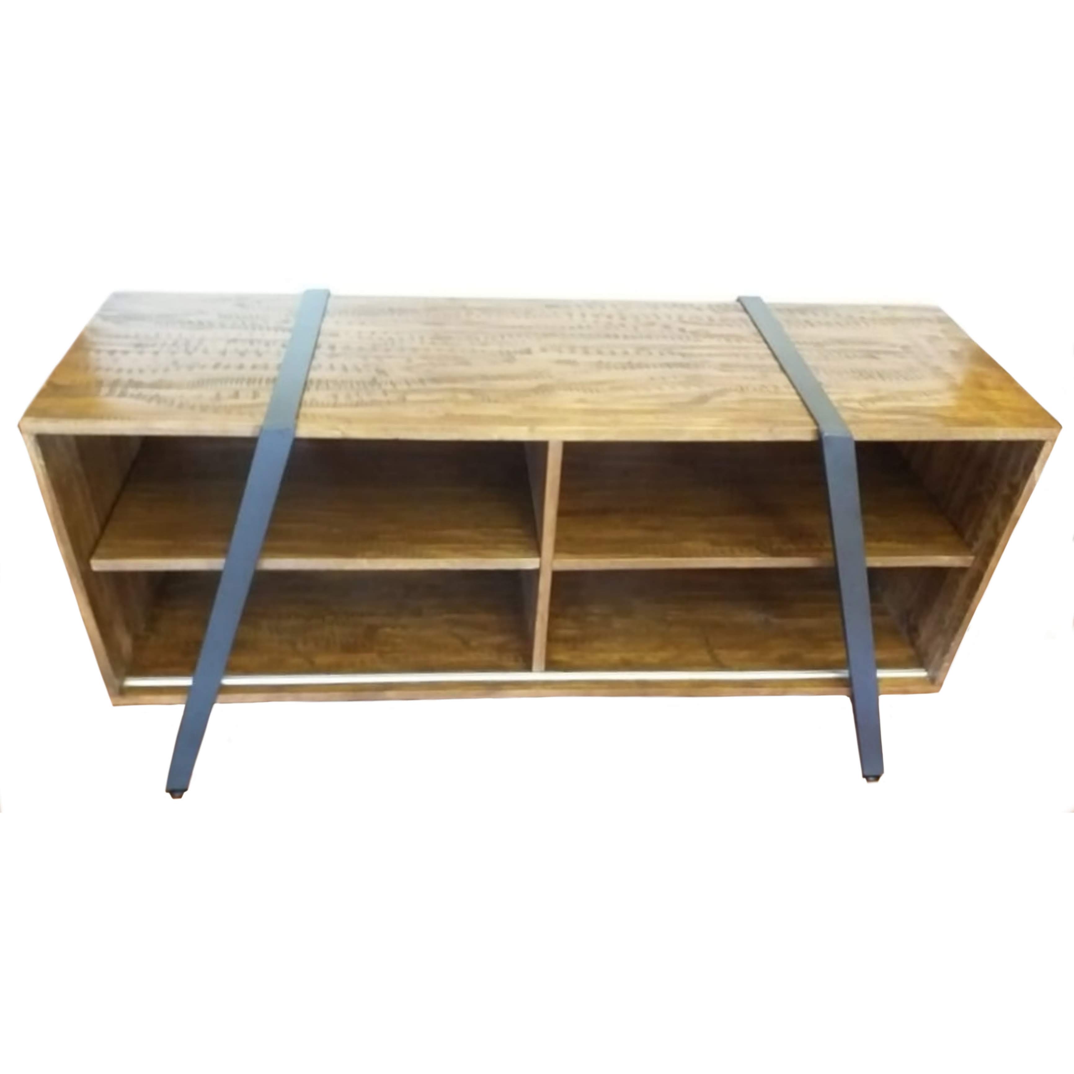 Rack fabricado em madeira maciça Araucária com pés de ferro galvanizado na cor grafiti.